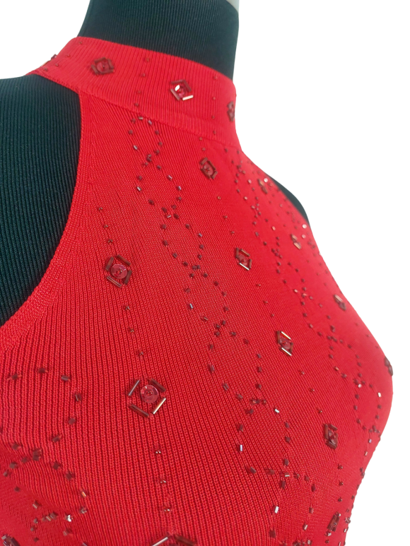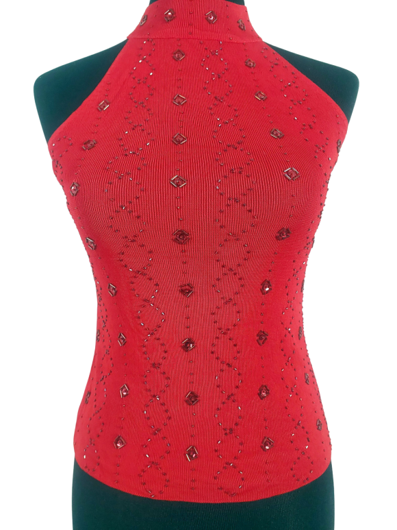 كنزة صوفية (Sweater) تلبس من فوق الرأس (Pullover) - خط عنق دائري، بدون ياقة، كتف من الحمّالات (Strap)، بدون أكمام - أحمر, مناسب لأكثر من قياس
