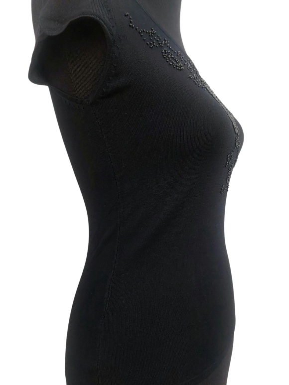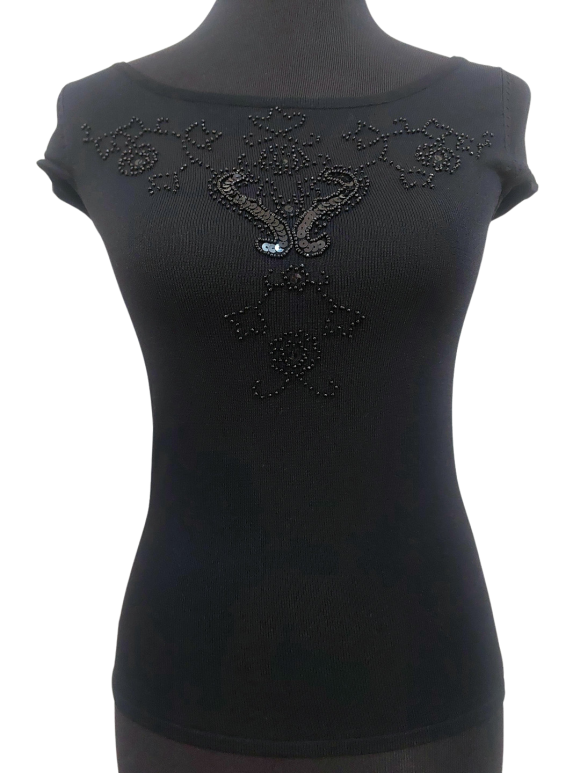 كنزة صوفية (Sweater) تلبس من فوق الرأس (Pullover) - خط عنق دائري، بدون ياقة، كتف عادي، أكمام قصيرة على شكل كاب (Cap) - أسود, XS