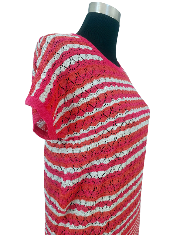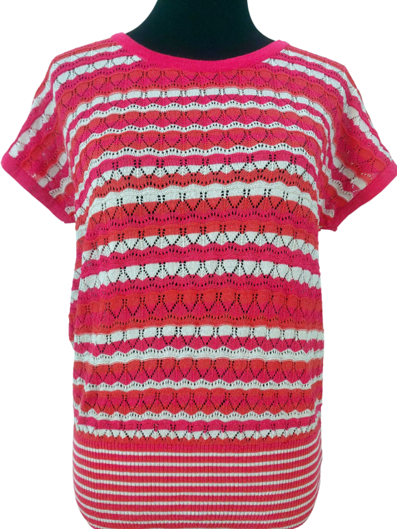 كنزة صوفية (Sweater) تلبس من فوق الرأس (Pullover) - خط عنق دائري، بدون ياقة، كتف عادي، أكمام قصيرة على شكل كاب (Cap) - زهري, M