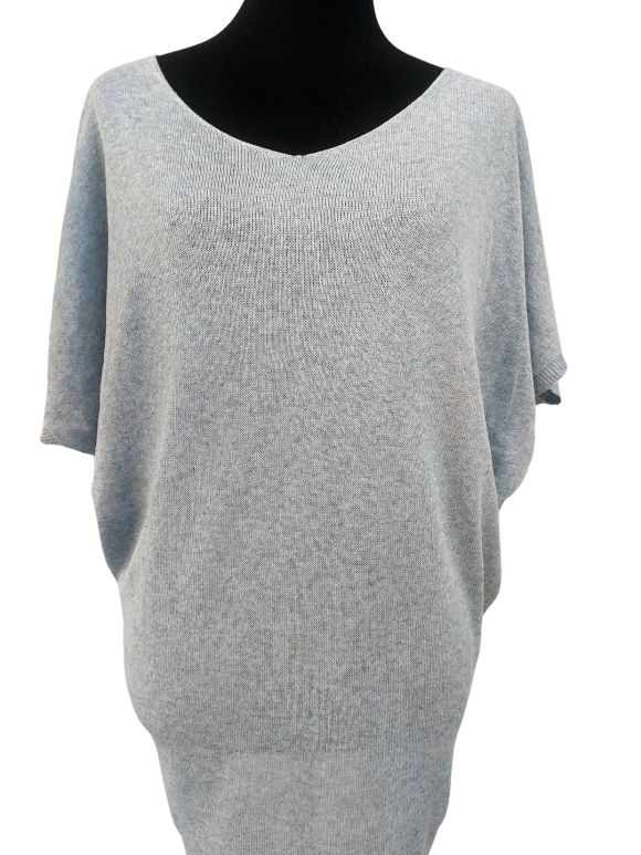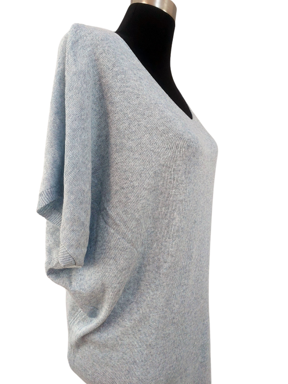 كنزة صوفية (Sweater) تلبس من فوق الرأس (Pullover) - خط عنق شكل ـ V ـ، بدون ياقة، كتف عادي، أكمام قصيرة بشكل جناح الخفاش (Batwing) - أزرق, مناسب لأكثر من قياس