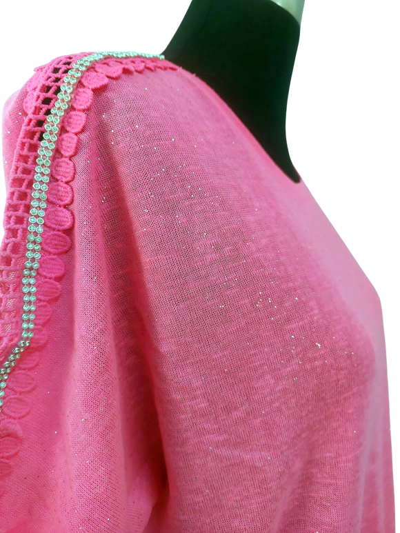 كنزة صوفية (Sweater) تلبس من فوق الرأس (Pullover) - خط عنق دائري، بدون ياقة، كتف عادي، أكمام قصيرة عادية (Plain) - زهري, مناسب لأكثر من قياس