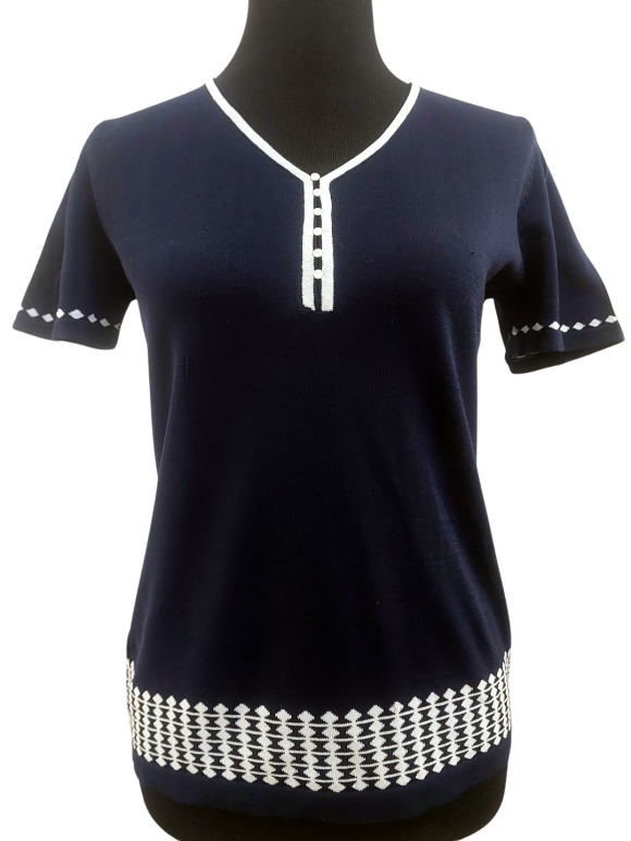 كنزة صوفية (Sweater) تلبس من فوق الرأس (Pullover) - خط عنق شكل ـ V ـ، بدون ياقة، كتف عادي، أكمام قصيرة عادية (Plain) - كحلي, L