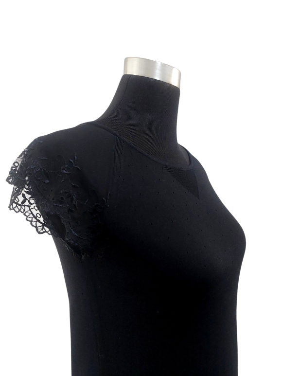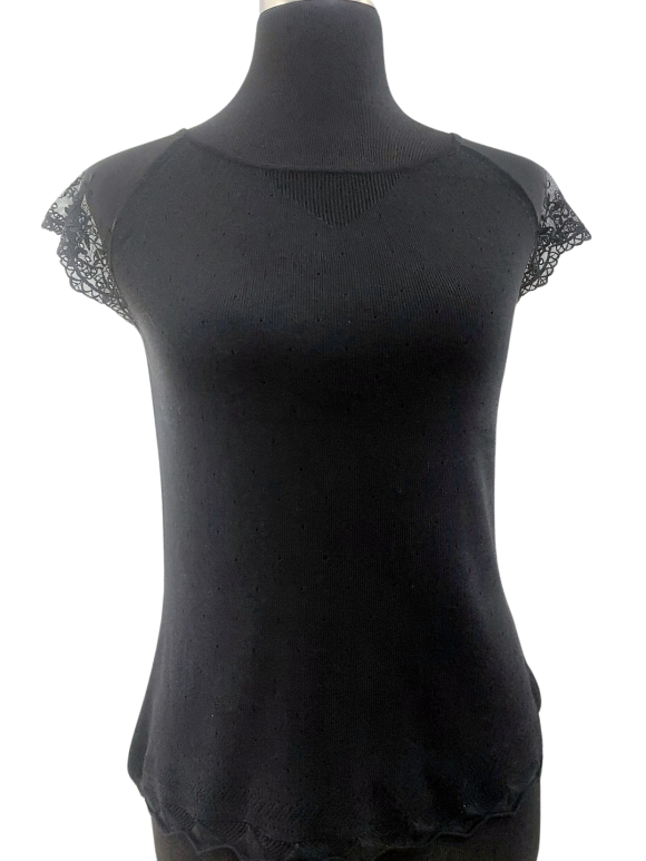 كنزة صوفية (Sweater) تلبس من فوق الرأس (Pullover) - خط عنق دائري، بدون ياقة، كتف عادي، أكمام قصيرة على شكل كاب (Cap) - أسود, مناسب لأكثر من قياس