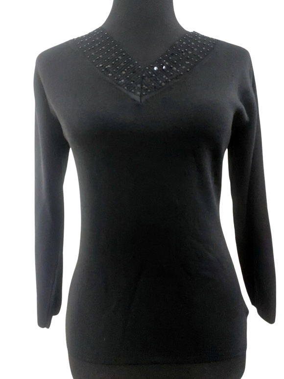 كنزة صوفية (Sweater) تلبس من فوق الرأس (Pullover) - خط عنق شكل ـ V ـ، بدون ياقة، كتف عادي، أكمام طويلة عادية (Plain) - أسود, M