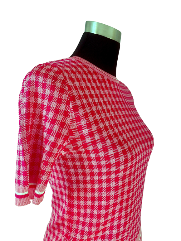 كنزة صوفية (Sweater) تلبس من فوق الرأس (Pullover) - خط عنق دائري، بدون ياقة، كتف عادي، أكمام قصيرة عادية (Plain) - زهري, S