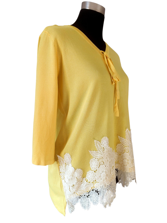 كنزة صوفية (Sweater) تلبس من فوق الرأس (Pullover) - خط عنق شكل ـ V ـ، بدون ياقة، كتف عادي، أكمام حتى الكوع بشكل جرس (Bell) - أصفر, L