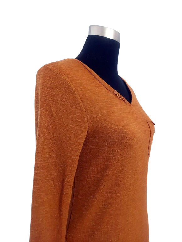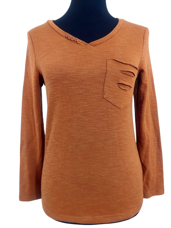 كنزة صوفية (Sweater) تلبس من فوق الرأس (Pullover) - خط عنق شكل ـ V ـ، بدون ياقة، كتف عادي، أكمام طويلة عادية (Plain) - بني, S