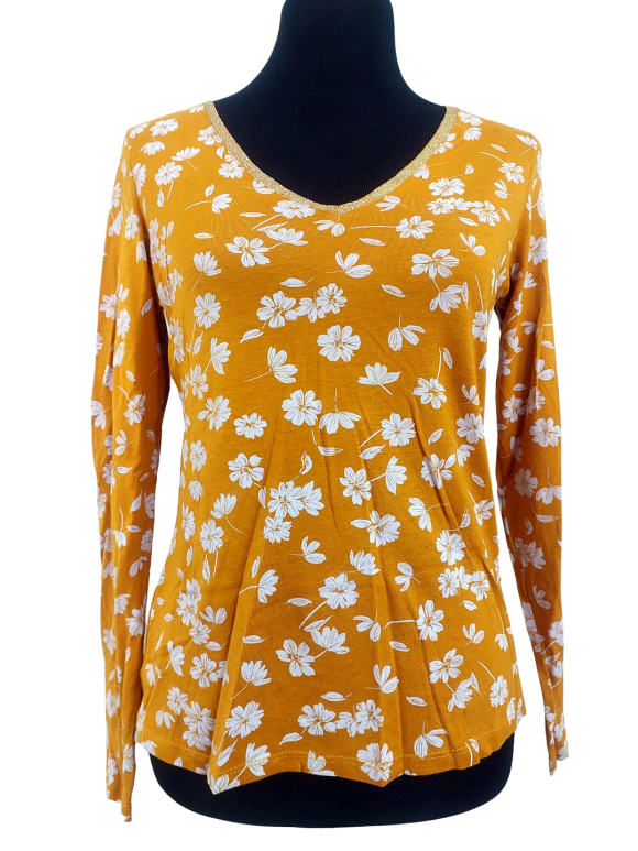 تيشيرت فضفاض (Relaxed) - خط عنق شكل ـ V ـ، بدون ياقة، كتف عادي، أكمام طويلة عادية (Plain) - بني فاتح, M