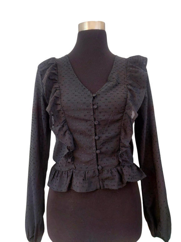 قميص - خط عنق شكل ـ V ـ، بدون ياقة، كتف عادي، أكمام طويلة عادية (Plain) - أسود, XS