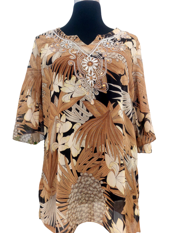 Blouse - Round neckline، No Collar، Regular shoulder، Short sleeve Plain - بني, M