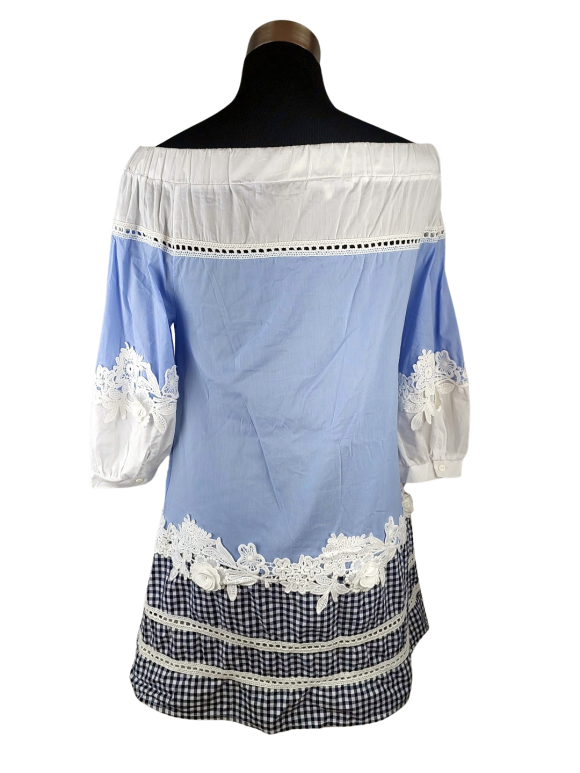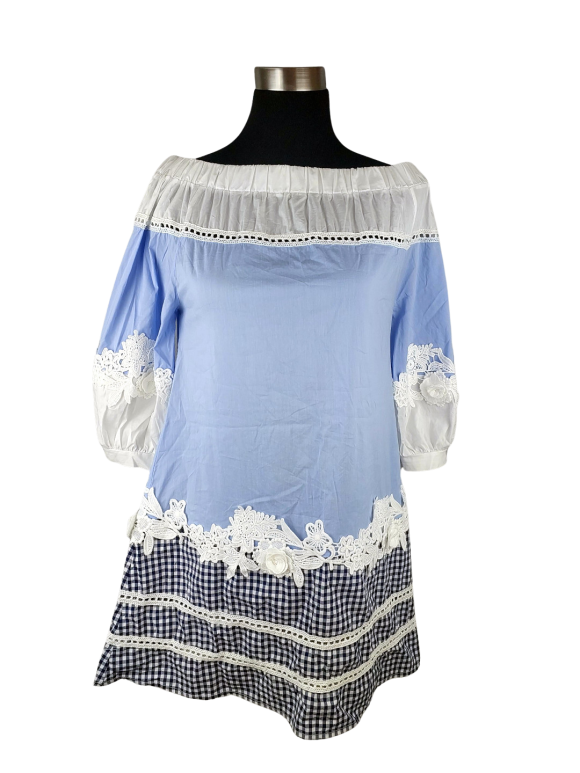فستان بلوزون (Blouson) - خط عنق على شكل قارب (Boat) بدون ياقة كتف بدون حمّالات (Strapless) أكمام حتى الكوع بطراز فلاحي (Peasant) - أزرق, M