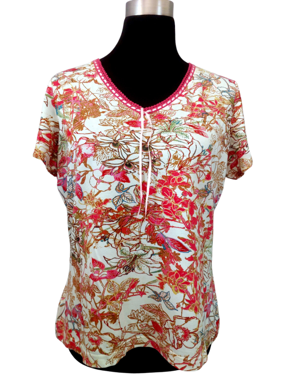 تيشيرت مريح (Relaxed) - خط عنق شكل ـ V ـ، بدون ياقة، كتف عادي، أكمام قصيرة عادية (Plain) - زهري, L