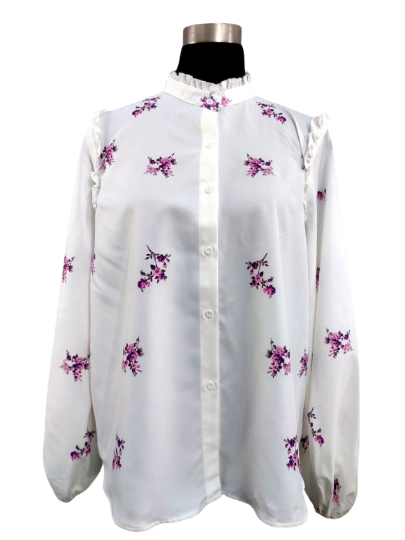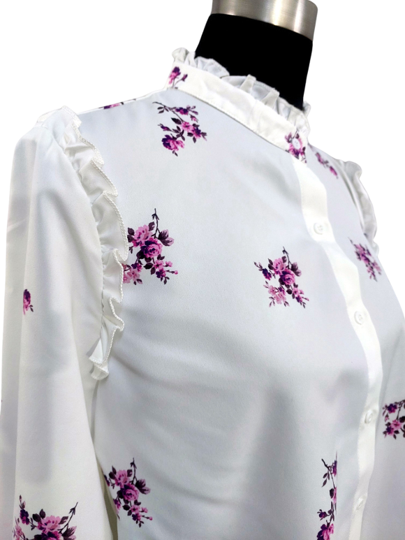 قميص - خط عنق دائري، ياقة مكشكشة (Ruffle)، كتف عادي، أكمام طويلة بطراز فلاحي (Peasant) - أبيض, L/XL