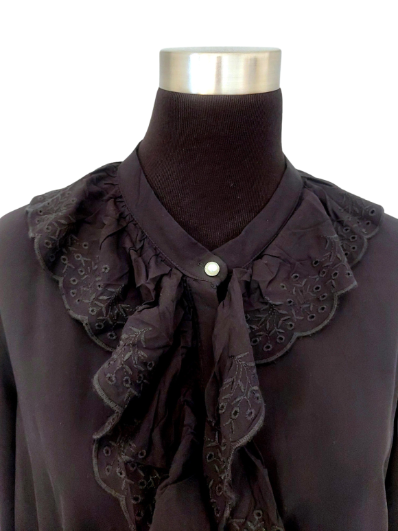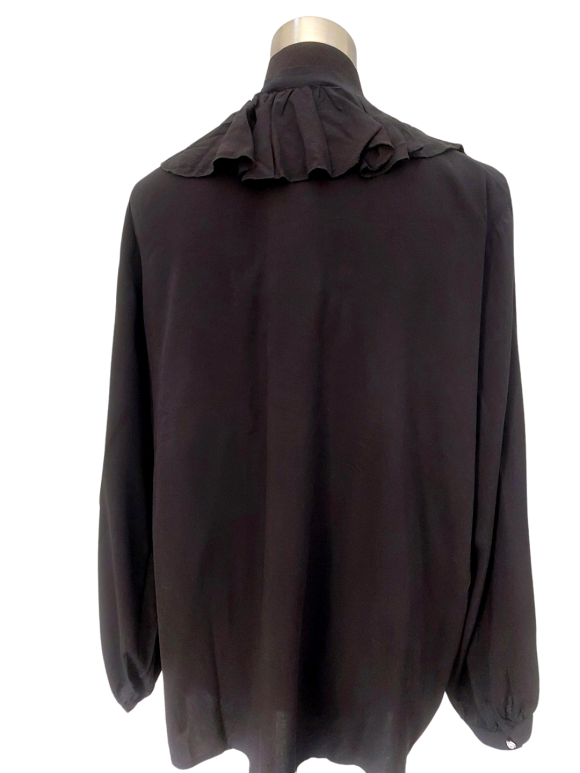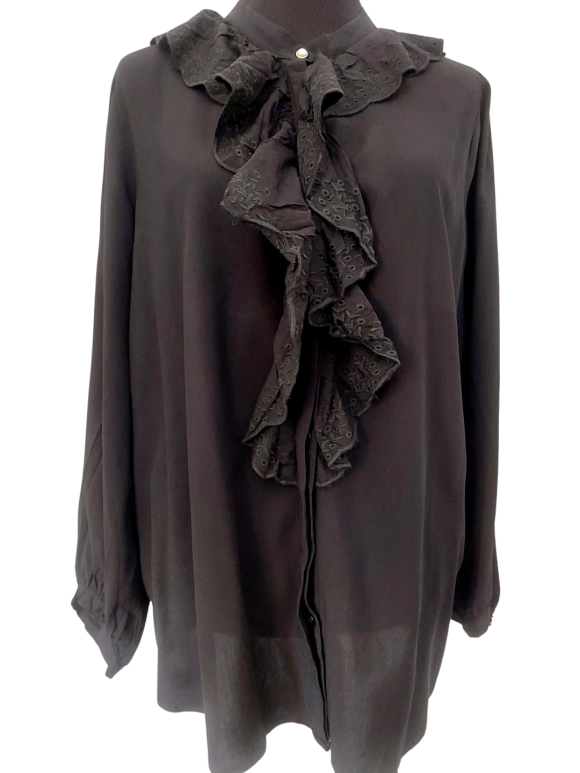 قميص - خط عنق دائري، ياقة مكشكشة (Ruffle)، كتف عادي، أكمام طويلة عادية (Plain) - أسود, XL/XXL