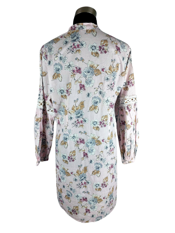 فستان بلوزون (Blouson) - خط عنق دائري بدون ياقة كتف عادي أكمام طويلة بطراز فلاحي (Peasant) - زهري, L