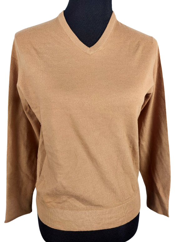 كنزة صوفية (Sweater) تلبس من فوق الرأس (Pullover) - خط عنق شكل ـ V ـ، بدون ياقة، كتف عادي، أكمام طويلة عادية (Plain) - بني, M