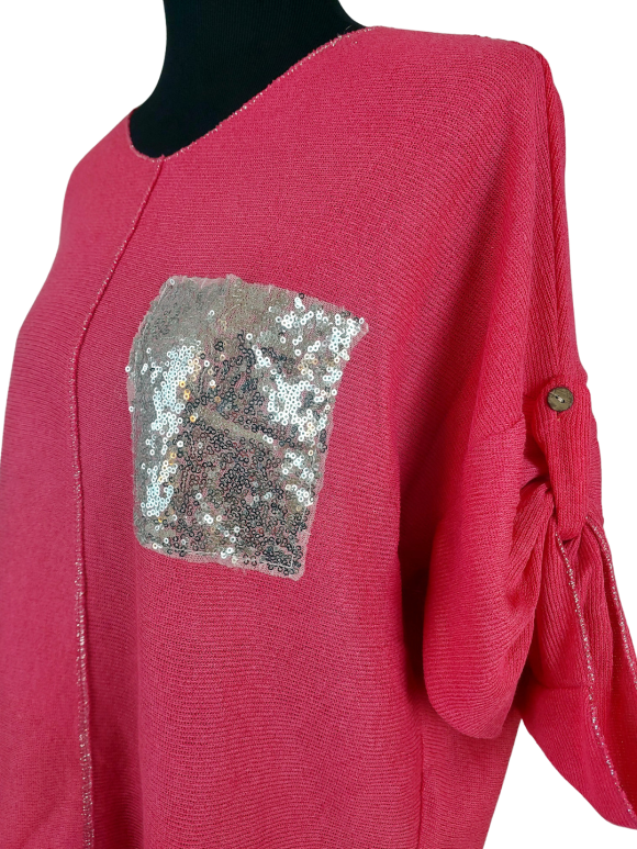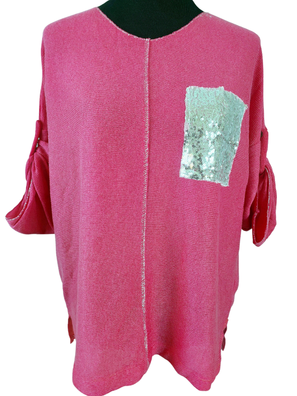 كنزة صوفية (Sweater) تلبس من فوق الرأس (Pullover) - خط عنق دائري، بدون ياقة، كتف عادي، أكمام حتى الكوع عادية (Plain) - زهري, مناسب لأكثر من قياس