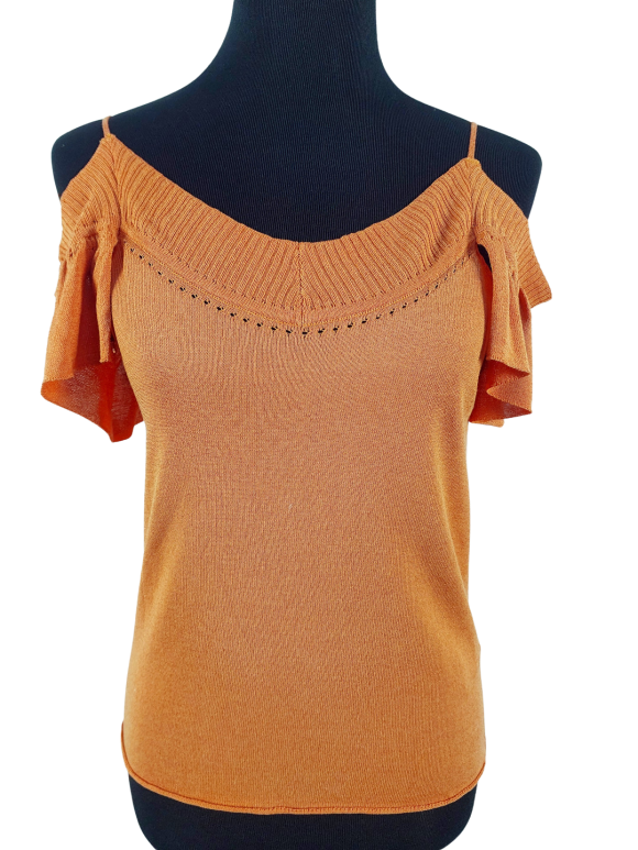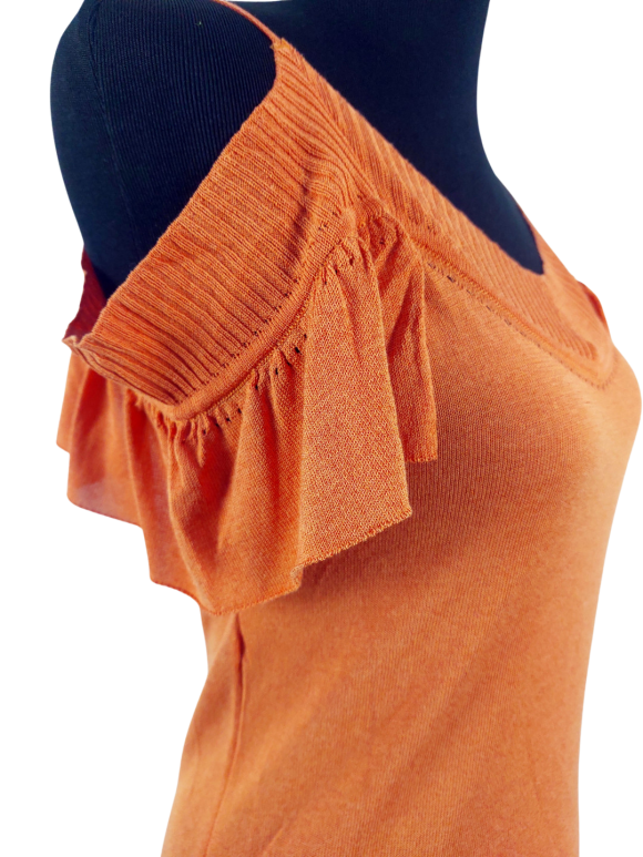 كنزة صوفية (Sweater) تلبس من فوق الرأس (Pullover) - خط عنق شكل ـ V ـ، بدون ياقة، كتف بحمالة رفيعة جدا (Spaghetti)، أكمام قصيرة بشكل جرس (Bell) - برتقالي, M