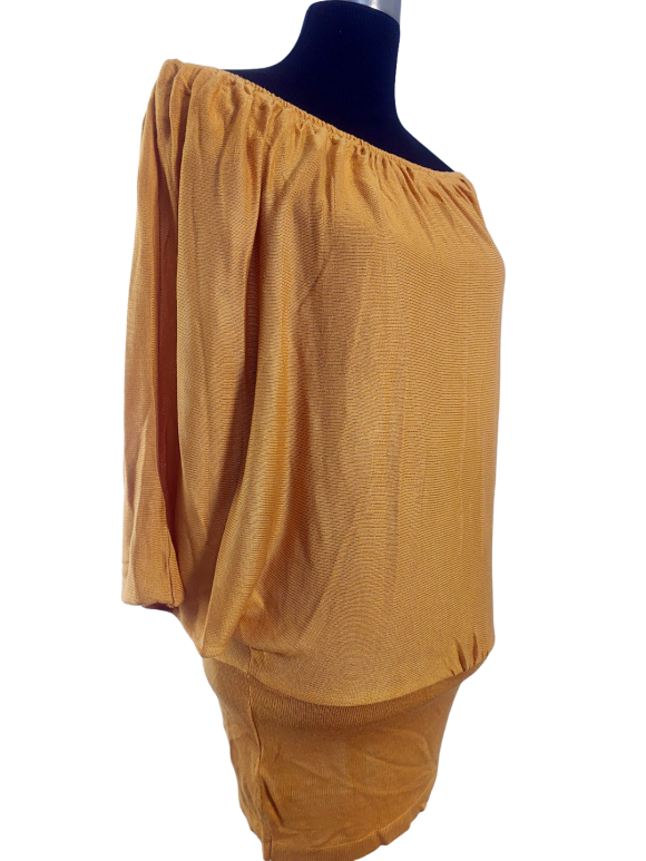 كنزة صوفية (Sweater) تلبس من فوق الرأس (Pullover) - خط عنق على شكل قارب (Boat)، بدون ياقة، كتف مكشوف من الأعلى (Off-the-shoulder)، أكمام حتى الكوع بشكل جناح الخفاش (Batwing) - بني, M