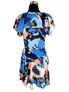 فستان بلوزون (Blouson) - خط عنق شكل ـ V ـ بدون ياقة كتف عادي أكمام قصيرة عادية (Plain) - أزرق, XS