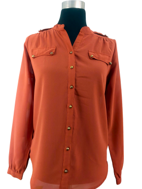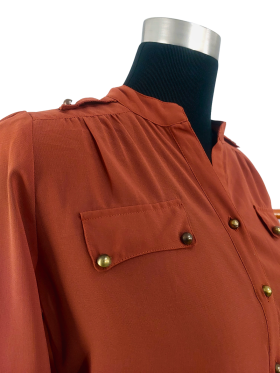 قميص - خط عنق شكل ـ V ـ، بدون ياقة، كتف عادي، أكمام طويلة عادية (Plain) - بني, S/M