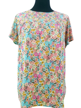 تونيك (Tunic) - خط عنق دائري، بدون ياقة، كتف عادي، أكمام قصيرة بشكل منتفخ (Puff) - زهري, S