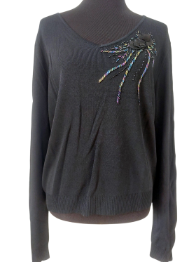 كنزة صوفية (Sweater) تلبس من فوق الرأس (Pullover) - خط عنق شكل ـ V ـ، بدون ياقة، كتف عادي، أكمام طويلة عادية (Plain) - أسود, XL