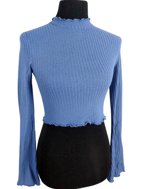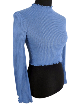كنزة صوفية (Sweater) تلبس من فوق الرأس (Pullover) - خط عنق دائري، بدون ياقة، كتف عادي، أكمام طويلة جدا بطراز فلاحي (Peasant) - أزرق, XS
