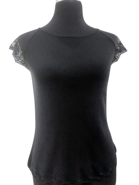 كنزة صوفية (Sweater) تلبس من فوق الرأس (Pullover) - خط عنق دائري، بدون ياقة، كتف عادي، أكمام قصيرة على شكل كاب (Cap) - أسود, مناسب لأكثر من قياس