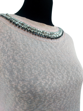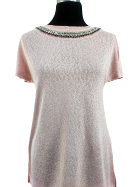 كنزة صوفية (Sweater) تلبس من فوق الرأس (Pullover) - خط عنق دائري، بدون ياقة، كتف عادي، أكمام قصيرة عادية (Plain) - زهري, S
