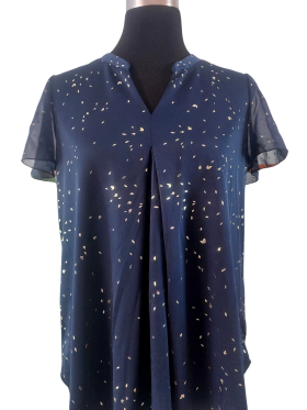 بلوزة - خط عنق شكل ـ V ـ، بدون ياقة، كتف عادي، أكمام قصيرة بشكل جرس (Bell) - كحلي, L