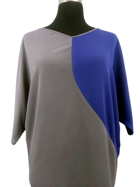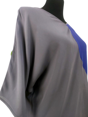 بلوزة - خط عنق شكل ـ V ـ، بدون ياقة، كتف عادي، أكمام حتى الكوع بشكل جناح الخفاش (Batwing) - رمادي, L