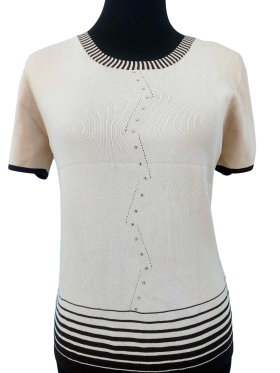 كنزة صوفية (Sweater) تلبس من فوق الرأس (Pullover) - خط عنق دائري، بدون ياقة، كتف عادي، أكمام قصيرة عادية (Plain) - بني فاتح, M