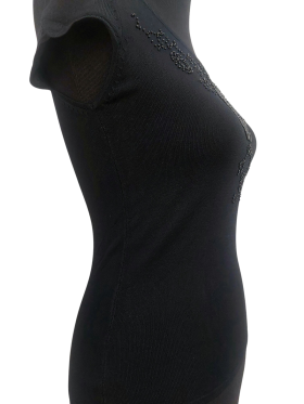 كنزة صوفية (Sweater) تلبس من فوق الرأس (Pullover) - خط عنق دائري، بدون ياقة، كتف عادي، أكمام قصيرة على شكل كاب (Cap) - أسود, XS