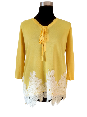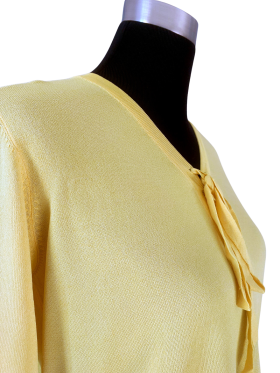 كنزة صوفية (Sweater) تلبس من فوق الرأس (Pullover) - خط عنق شكل ـ V ـ، بدون ياقة، كتف عادي، أكمام حتى الكوع بشكل جرس (Bell) - أصفر, L