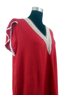 تيشيرت مريح (Relaxed) - خط عنق شكل ـ V ـ، بدون ياقة، كتف عادي، أكمام قصيرة بشكل جرس (Bell) - أحمر, XL