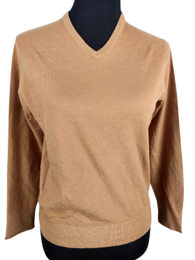 كنزة صوفية (Sweater) تلبس من فوق الرأس (Pullover) - خط عنق شكل ـ V ـ، بدون ياقة، كتف عادي، أكمام طويلة عادية (Plain) - بني, M