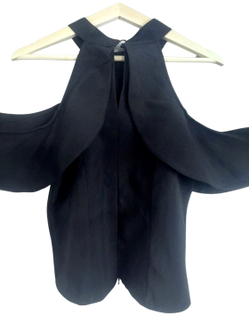 بلوزة - خط عنق دائري، بدون ياقة، كتف بحمالة هالتر (Halter)، أكمام قصيرة على شكل كاب (Cap) - أسود, XS